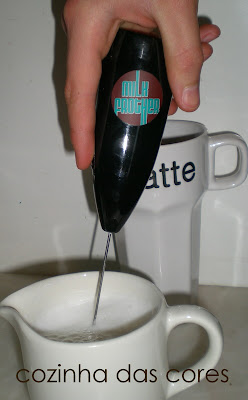 Com este instrumento tão simples e tão eficaz (Milk frother) faço a espuma em 2 segs(!). Desta vez foi o meu filho (para eu poder tirar a fotografia...)